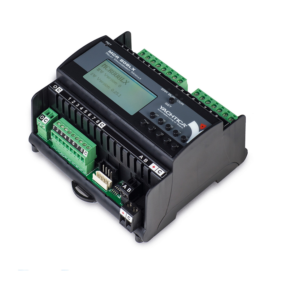 L’MCR 808LX è un modulo con microcontrollore integrato programmabile, dotato di 8 uscite a relè, per il controllo di sorgenti luminose o dispositivi in modalità on/off. Il modulo permette il controllo e la gestione di dispositivi e di sorgenti luminose a 12/24VDC/AC, 110/230VAC con un assorbimento massimo di 16A per ciascuna uscita. Può essere usato anche per attivare dispositivi a contatto pulito quali ad esempio centraline per il controllo di tende o lift TV.