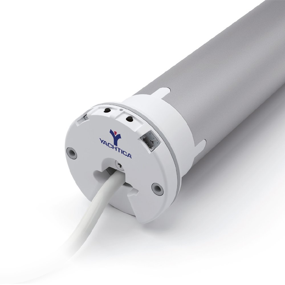 Motore tubolare con finecorsa elettronico dotato di ingresso Yachtica® EasyBUS posizionato sulla testa del motore. Tutte le funzionalità del motore sono gestibili tramite il software di programmazione Yachtica® Cabot con il quale è possibile anche garantire un allineamento perfetto tra più motori installati nello stesso ambiente.